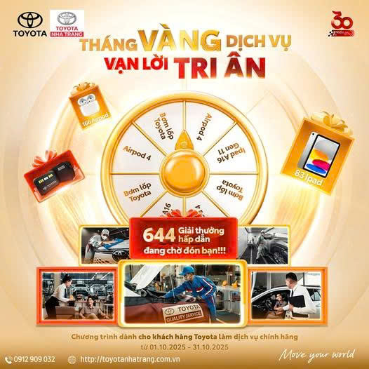 Áp dụng từ 01/04/2025 đến khi có thông báo kết thúc! Với phương châm “Khách hàng là trên hết”, Toyota Nha Trang trân trọng triển khai chương trình quay số trúng thưởng dành cho các khách hàng tích cực thực hiện khảo sát về chất lượng Bán hàng và Dịch vụ tại Đại lý.