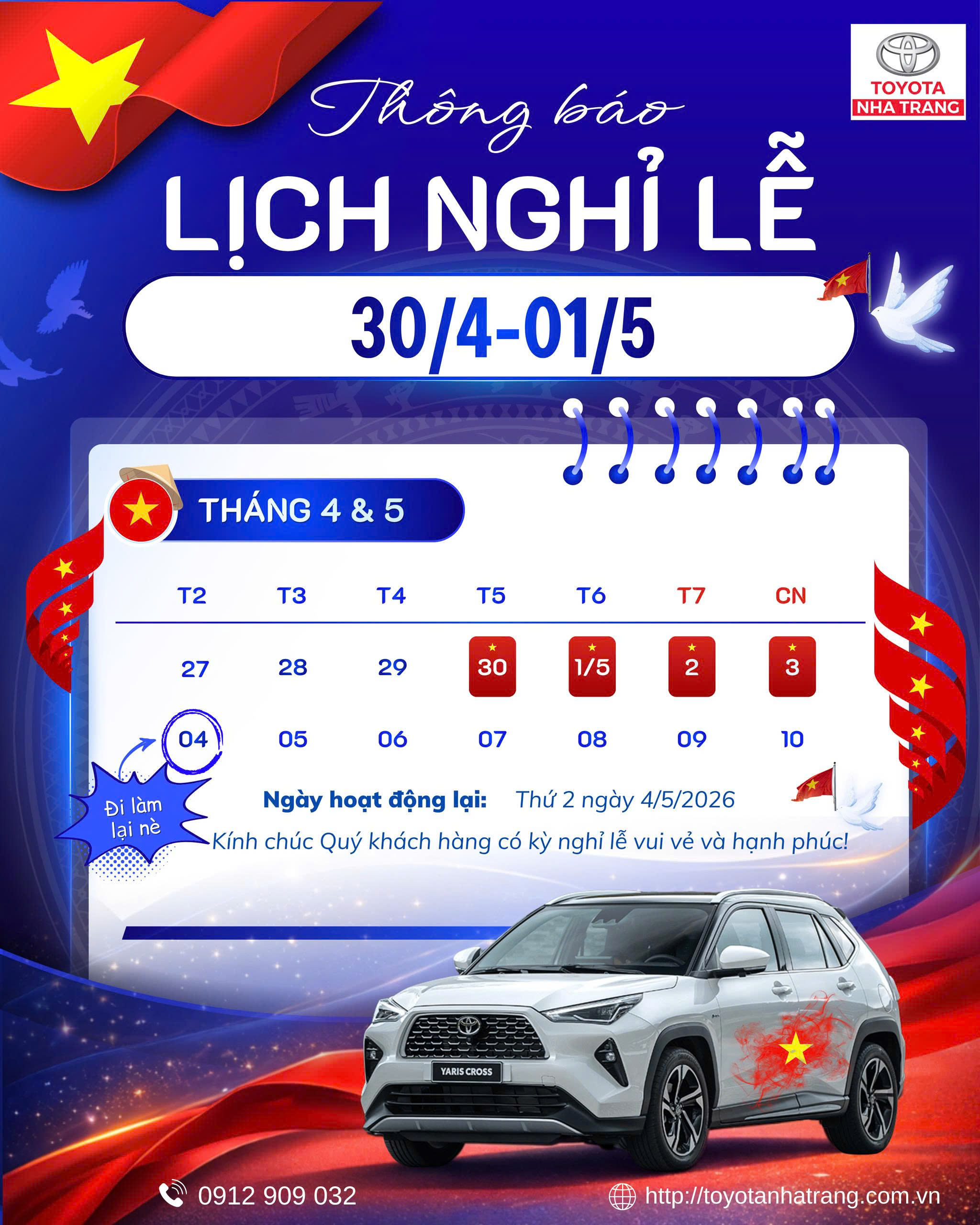 Công ty Cổ phần Toyota Nha Trang xin trân trọng thông báo đến Quý khách hàng lịch nghỉ hoạt động nội bộ nhằm phục vụ công tác sắp xếp nội bộ, cụ thể như sau: